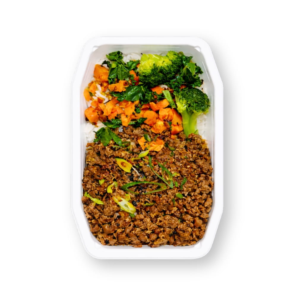 Kalorier 562Protein 41gKoreanskinspirerad nötfärs med basmatiris, grönkål, broccoli och morot.115 kr -