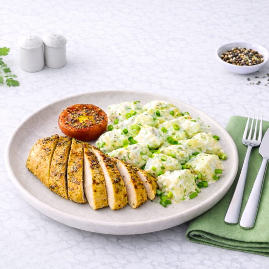 Kycklingfilé, tomat och en krämig laktosfri potatissallad. Kan ätas både varm och kall