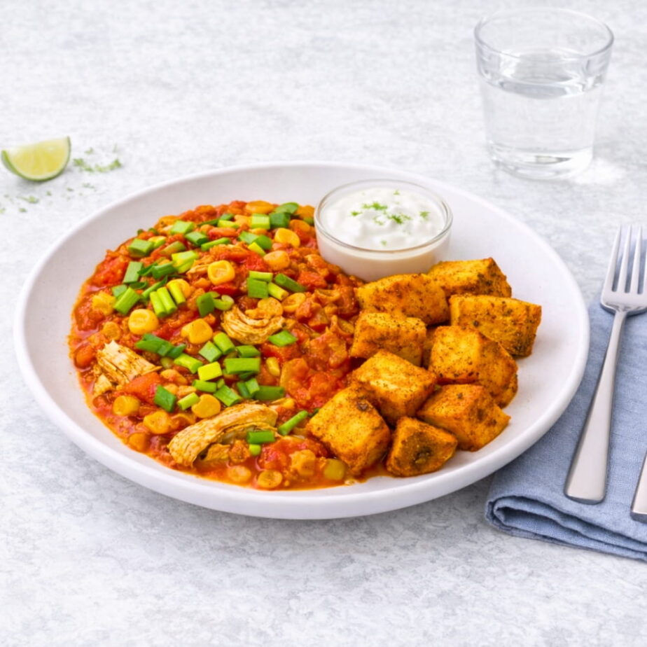 Sydamerikansk kycklinggryta med sötpotatis, majs och frisk yoghurt limesås.