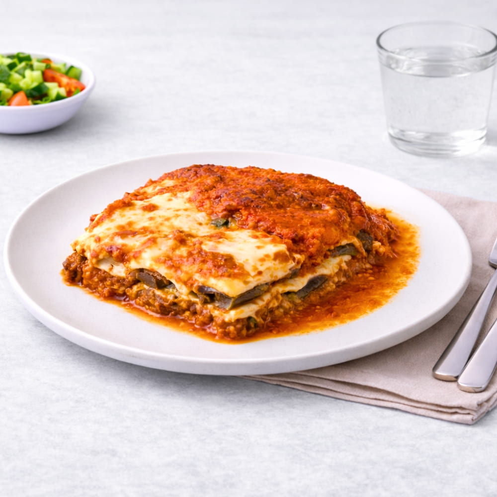 Nötfärs(32,5%), Krossade tomater, Kvarg laktosfri (pastöriserad MJÖLK, mjölksyrekultur, ystensym, laktazensym), Aubergine, Gul lök, Keso laktosfri (MJÖLK), Mozzarella (MJÖLK), Grana padano (MJÖLK, ÄGG), Vatten, Vitlök, Svartpeppar, Salt m jod, Oregano, Timjan, Basilika
